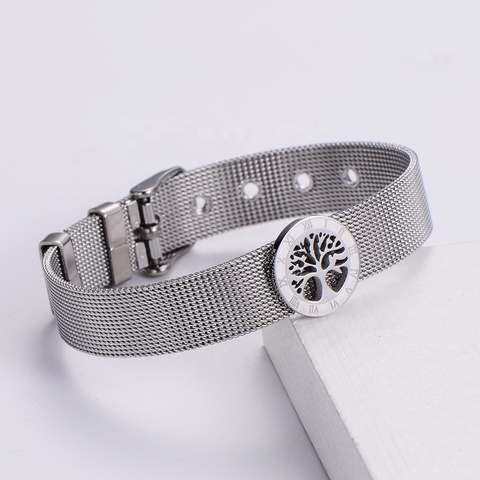 سوار سوار بحزام شبكي من الفولاذ المقاوم للصدأ مع 12 شجرة مجوهرات كلاسيكية منقوشة للحياة من الأرقام الرومانية