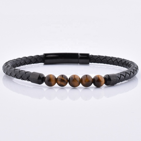 Оптовая продажа кожи из натурального камня маленький Ограненный тигровый глаз обсидиан браслет из нержавеющей стали с застежкой из бисера кожаный браслет