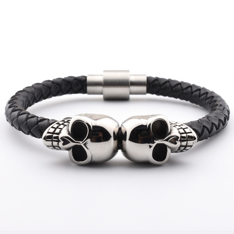 Оптовая Продажа двойной череп плетеный кожаный манжета черный натуральная кожа браслеты для мужчин