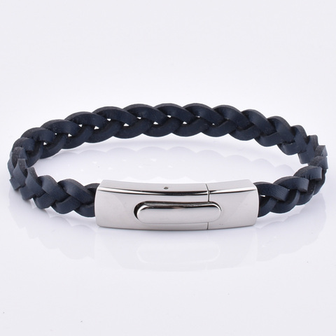 Высокополированный индивидуальный Плетеный темно-синий тканый кожаный серебряный браслет с застежкой